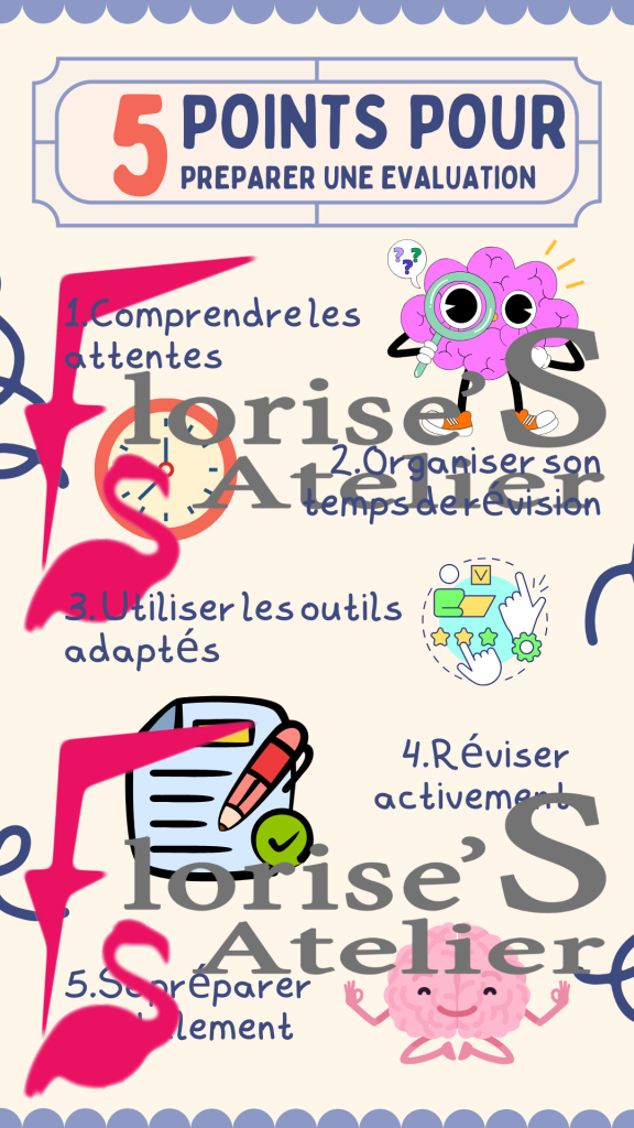 Ce matériel pédagogique vous aide à préparer efficacement une évaluation en suivant cinq étapes clés.